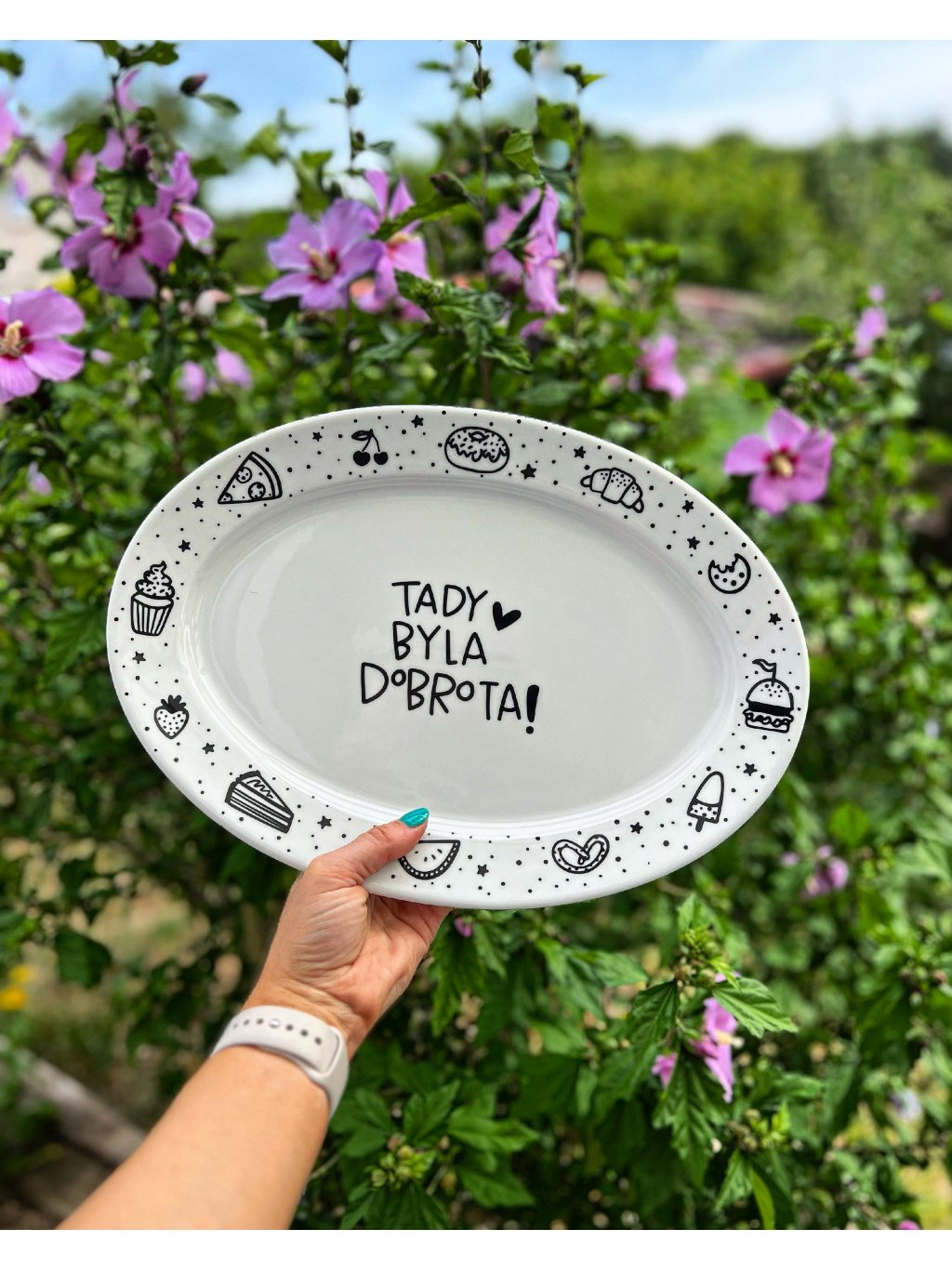Ovál TADY BYLA DOBROTA je z kolekce tištěných oválů, které vznikly v roce 2023. Jedná se o autorský motiv od Estetič.Ka. Původně byly ručně malované, ale v rámci užívání se přešlo na vhodnější výrobu.