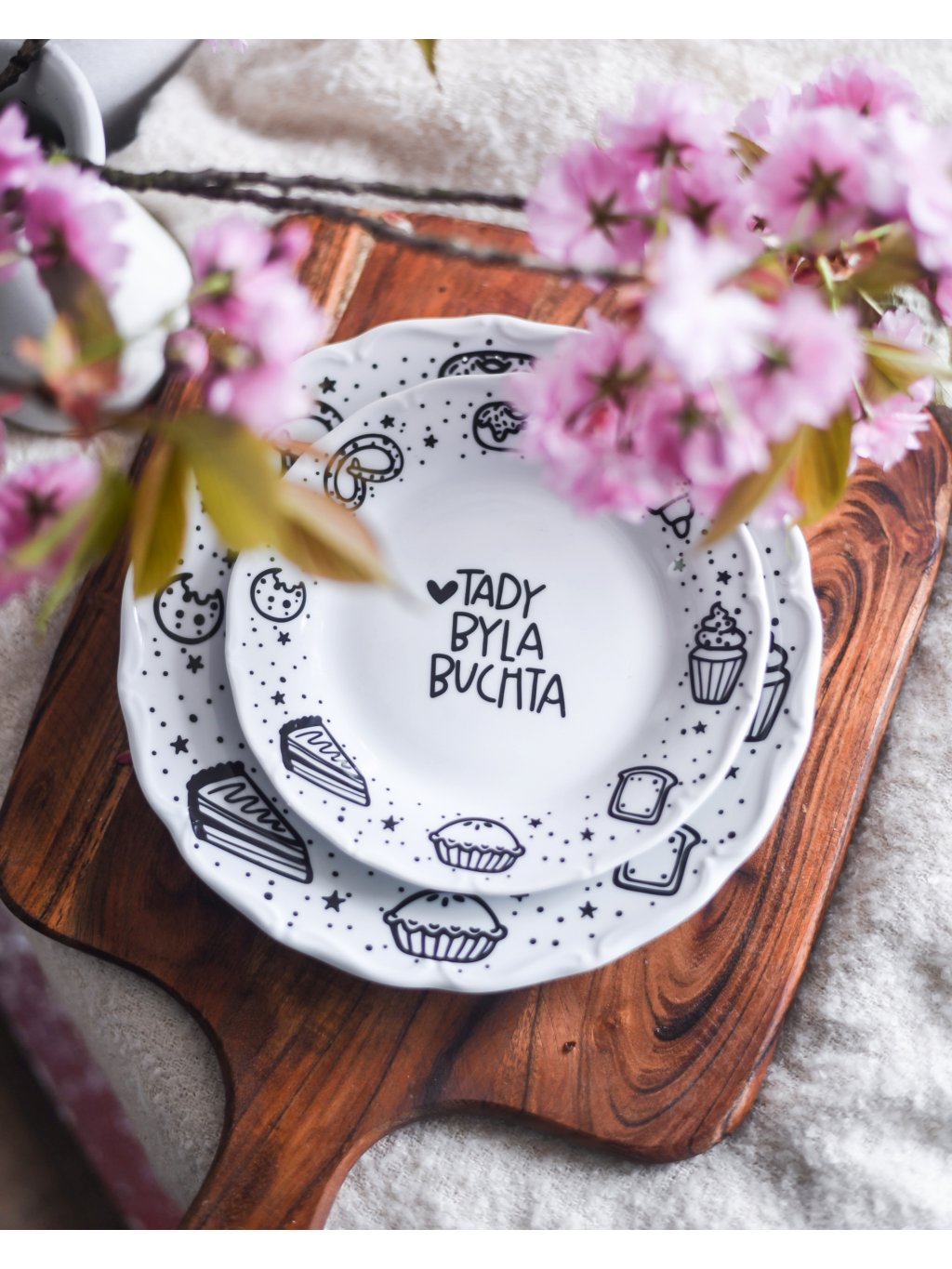 Talíře TADY BYLA BUCHTA jsou z kolekce tištěných talířů, které vznikly v roce 2023. Jedná se o autorský motiv od Estetič.Ka. Původně byly ručně malované, ale v rámci užívání se přešlo na vhodnější výrobu.