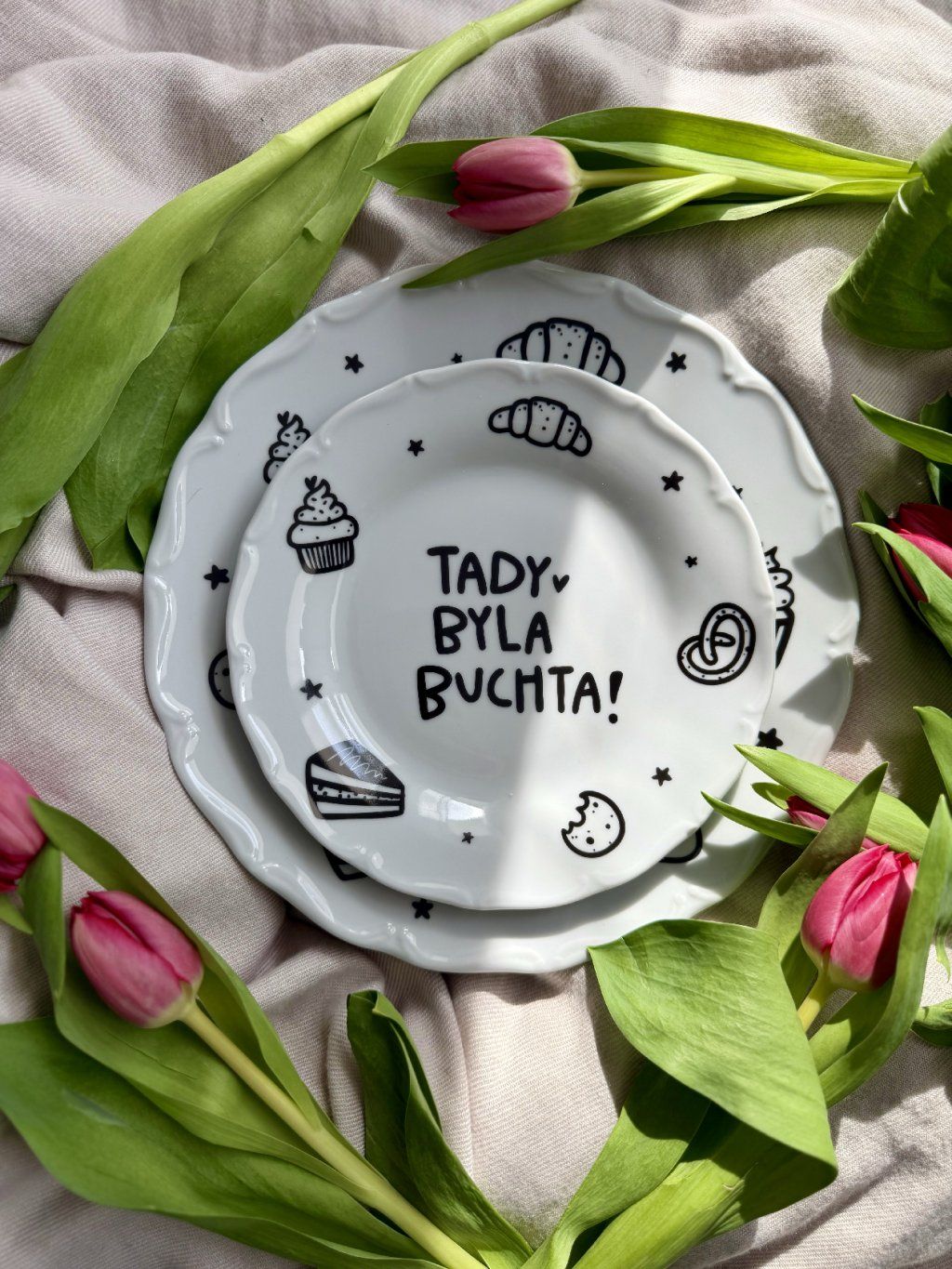 Talíře TADY BYLA BUCHTA jsou z kolekce tištěných talířů, které vznikly v roce 2023. Jedná se o autorský motiv od Estetič.Ka. Původně byly ručně malované, ale v rámci užívání se přešlo na vhodnější výrobu.