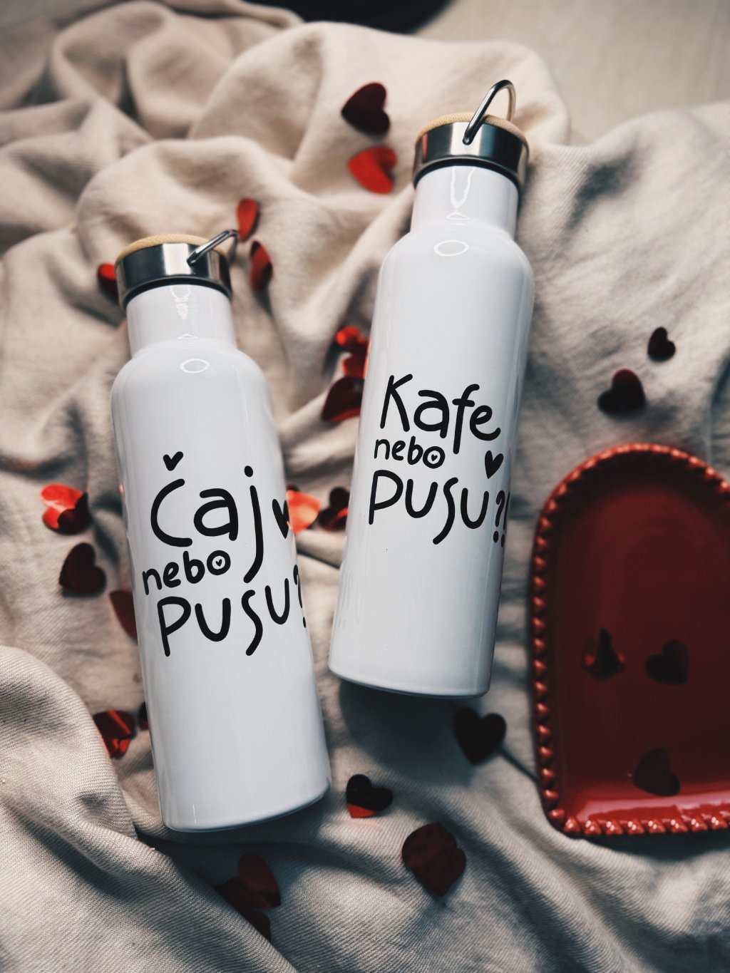 Termoláhev Čaj nebo pusu?! je ideální na všechny vaše výlety, ale klidně i do práce. Jedná se o nerezovou láhev se šroubovacím závitem. Láhev neprotýká a udrží nápoj teplý i 12 hodin.